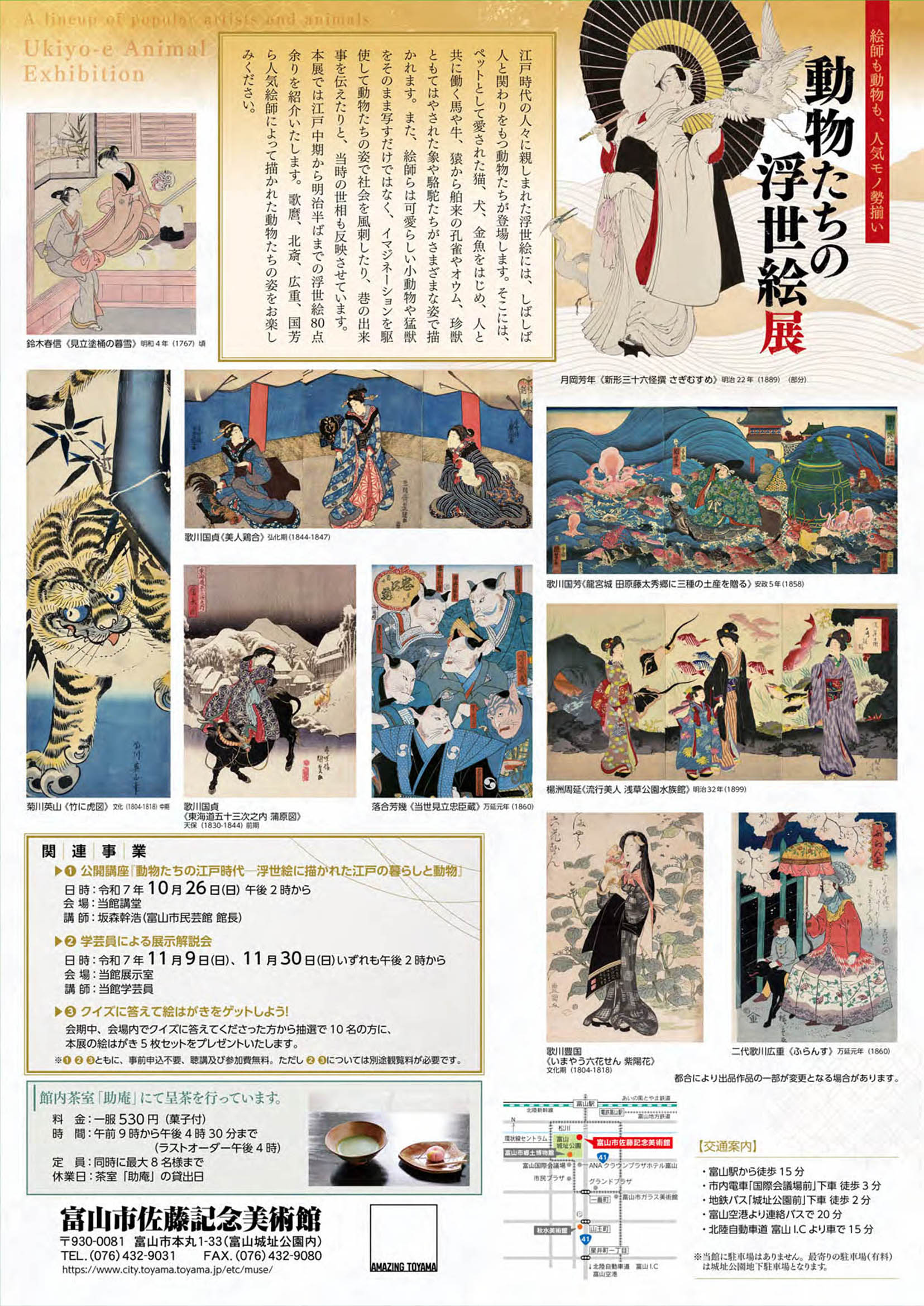 江戸時代の人々に親しまれた浮世絵には、しばしば人と関わりをもつ動物たち が登場します。そこには、ペットとして愛された猫、犬、金魚をはじめ、人と 共に働く馬や牛、猿から舶来の孔雀やオウム、珍獣ともてはやされた象や駱駝 たちがさまざまな姿で描かれます。また、絵師らは可愛らしい小動物や猛獣を そのまま写すだけではなく、イマジネーションを駆使して動物たちの姿で社会 を風刺したり、巷の出来事を伝えたりと、当時の世相も反映させています。 本展では、江戸中期から明治半ばまでの浮世絵80点余りを紹介いたします。歌 麿、北斎、広重、国芳ら人気絵師によって描かれた動物たちの姿をお楽しみく ださい。 ◇ 会 期 令和7年10月18日(土)~12月7日(日) 会期中無休 ◇ 開館時間 午前9時~午後5時(入館受付午後4時30分まで) ◇ 場 所 富山市佐藤記念美術館 →交通アクセスはこちら ◇ 観 覧 料 大人 400円 高校生以下無料 ◇ 主 催 富山市教育委員会(富山市佐藤記念美術館)、富山市 ◇ 監 修 中右 瑛 (国際浮世絵学会常任理事) ◇ 企画協力 E.M.I.ネットワーク ◇◇ 公開講座 ◇◇ 「動物たちの江戸時代-浮世絵に描かれた江戸の暮らしと動物」 10月26日(日)午後2時から 会場:当館講堂 講師:坂森幹浩(富山市民芸館 館長) ※事前申込不要、聴講無料 → 詳細はこちら ◇◇ 学芸員による展示解説会◇◇ 11月9日(日)・11月30日(日) 午後2時より当館展示室にて ※事前申込不要、要観覧料 ◇◇ クイズに答えて絵はがきをゲットしよう! ◇◇ 会期中、会場内でクイズに答えてくださった方から抽選で10名の方に、 本展の絵はがき5枚セットをプレゼントいたします。