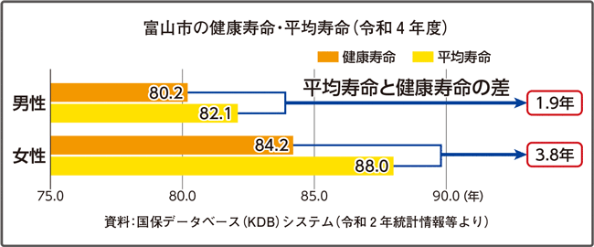 健康寿命を、「日常生活の動作が自立している期間」として、市では、健康寿命の延伸と平均寿命の増加分を上回る健康寿命の増加(平均寿命と健康寿命の差の短縮)を目指します。
