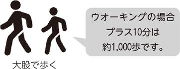 運動時間を+10する(1日に10分多く身体を動かす)だけで、健康寿命が延伸すると言われています。普段から身体を動かすことで、糖尿病、心臓病、脳卒中、がん、ロコモティブシンドローム※1、うつ病、認知症などになるリスクを下げることができます。