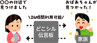発見者が発見場所や本人の健康状態を入力すると、家族などに発見通知メールが届きます。当事者のみ閲覧可能などこシル伝言板を通してやり取りができます。
