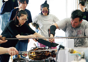 富山ガラス工房新館長の高橋禎彦と工房スタッフら総勢15名による共同制作です。普段は見ることができないスタッフたちのチームワークをご覧ください。