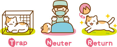TNRとは、Trap(捕獲)・Neuter(不妊手術)・Return(元に戻す)の頭文字をとったもので、外猫の数を管理し、無秩序な繁殖を防ぐ方法です。