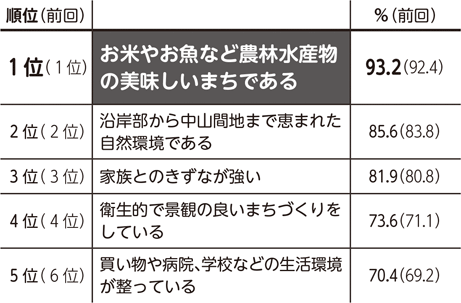 「お米やお魚など農林水産物の美味しいまちである」の項目に対して、「そう思う」または「どちらかといえばそう思う」と回答した割合が93.2%と最も高くなっています。
