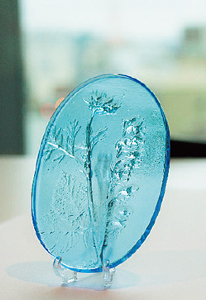 電気炉(キルン)を使ってガラスを溶かし、植物の模様が入ったガラス作品を制作します。