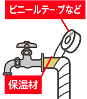 ●凍りやすい水道管には、市販の保温材を巻きつけ、濡れないようビニールテープなどを隙間なく重ねて巻いてください。