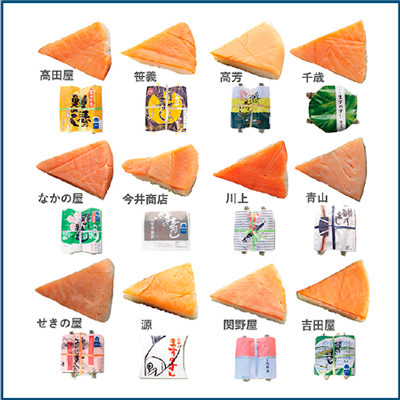 会場で12店舗分のます寿し(16分の1切れサイズ)を食べ比べし、酸味や甘味などの観点から評価していただいたものを基に、チャートを作成します。作成したチャートは、市民の皆さんや観光客の方がます寿しを購入されるときの参考となるように、ホームページで公開するほか、富山ます寿し協同組合加盟店などで活用されます。