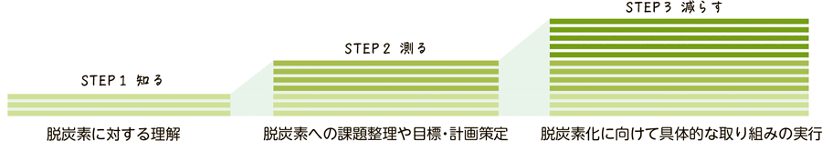 企業の脱炭素化に向けた有効な取り組みとして、3つのステップ「知る・測る・減らす」を段階的に実行することを国が推奨しています。